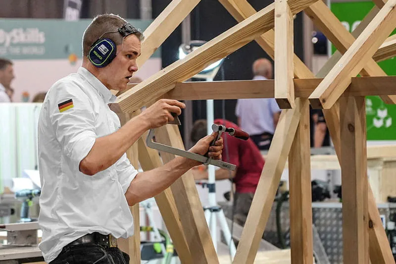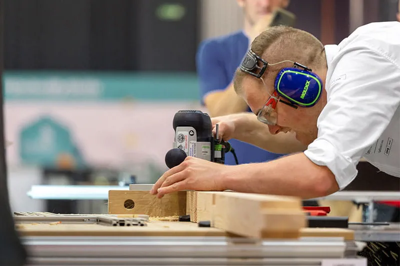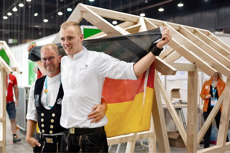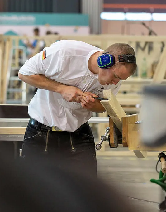 Lorsque Jonas Lauhoff évoque le concours six mois plus tard, il semble encore avoir une bonne dose d'adrénaline dans le sang. D'une part parce qu'il est parvenu à réaliser son rêve aux EuroSkills de Gdansk. Mais aussi parce qu'il a remporté cette victoire à la sueur de son front. Le jeune homme originaire de Thuringe a fait son apprentissage de charpentier chez Zimmerei & Holzbau Ständer, une petite entreprise de menuiserie spécialisée installée à Geismar. Après son examen final d'apprentissage, auquel il obtient les meilleures notes, Jonas Lauhoff enchaîne les victoires aux concours. En juin 2021, il rejoint l'équipe allemande et se qualifie neuf mois plus tard pour les EuroSkills de Gdansk.