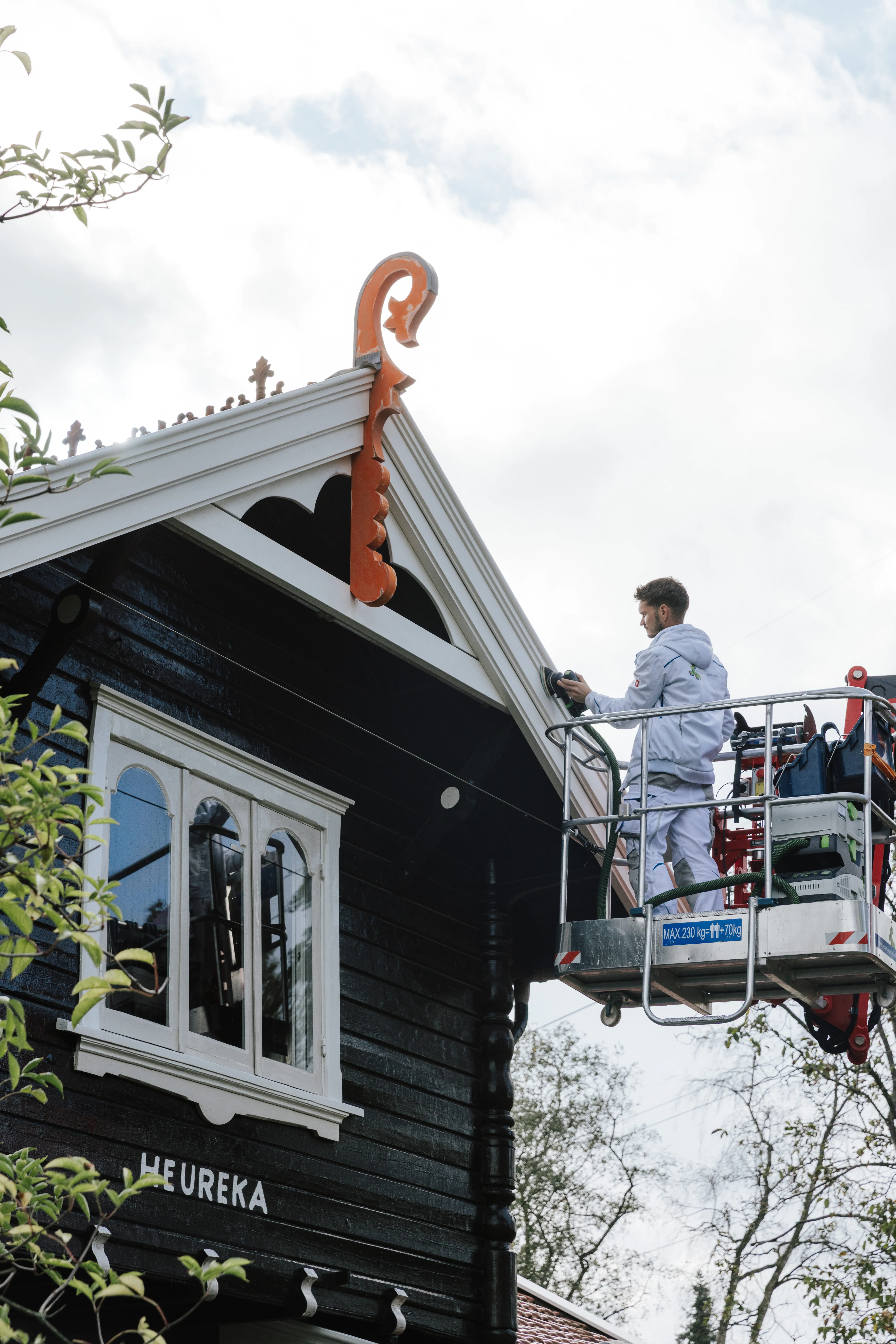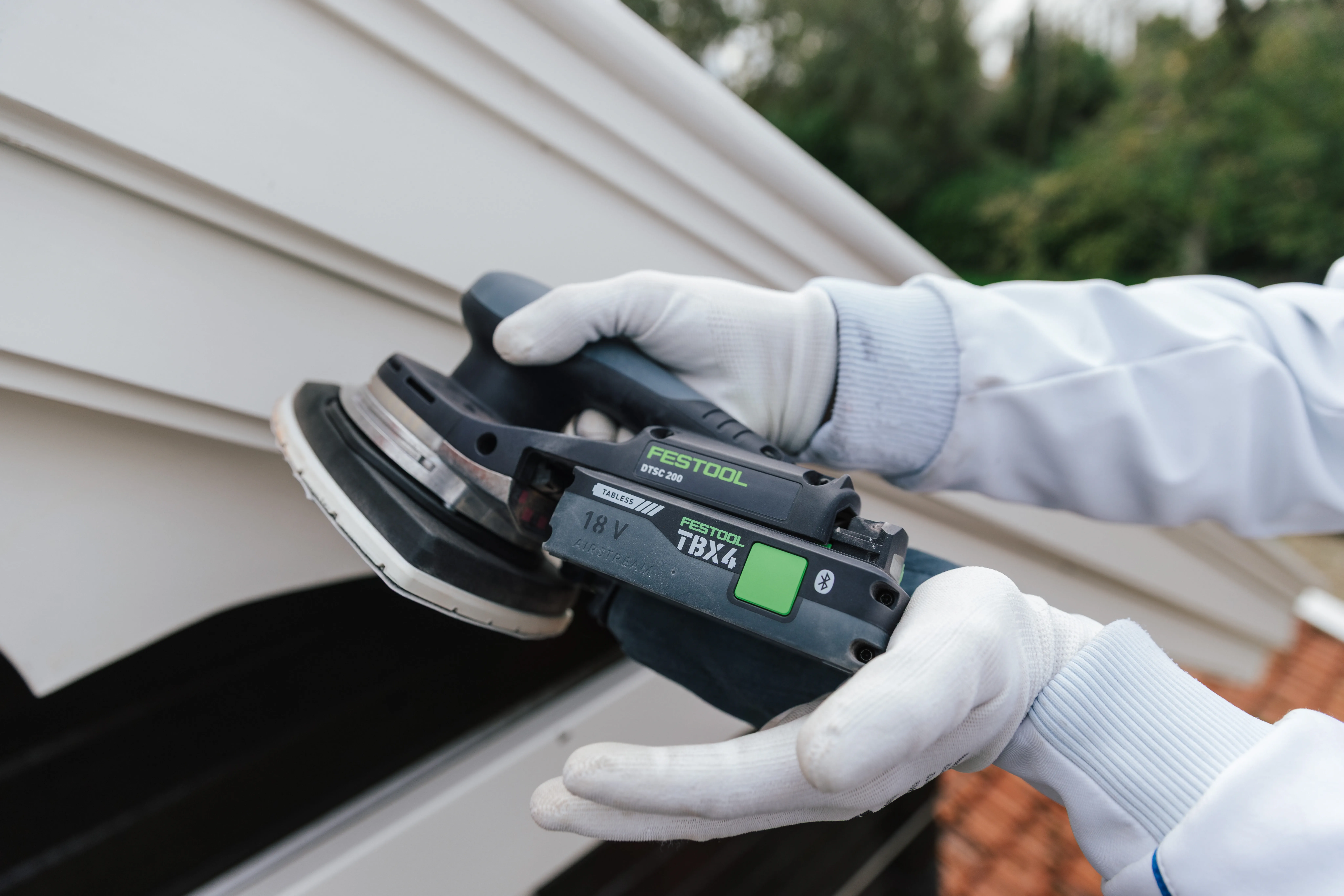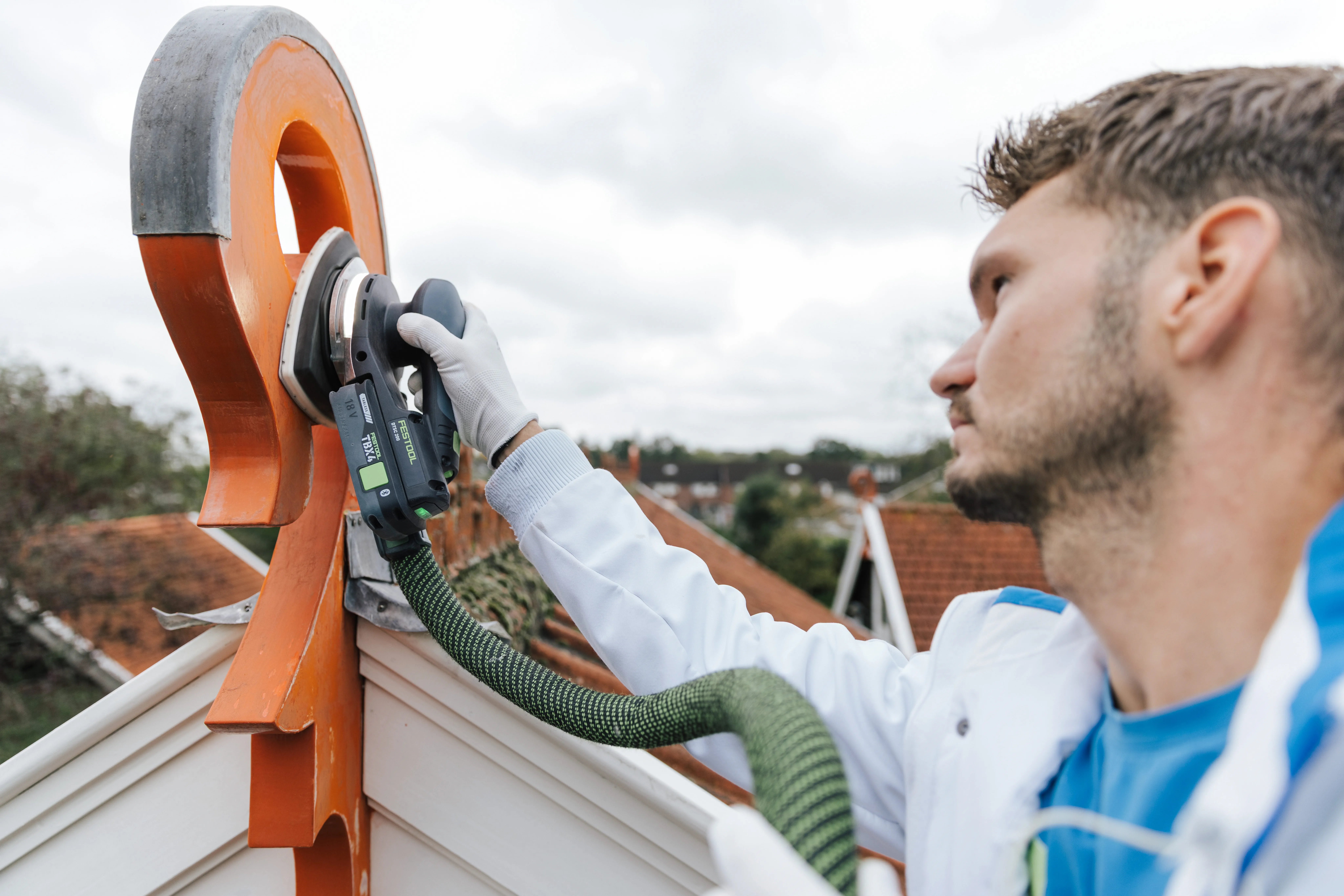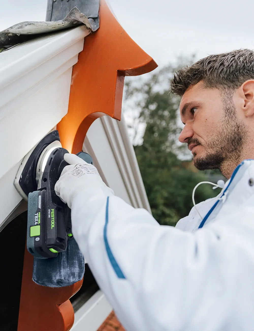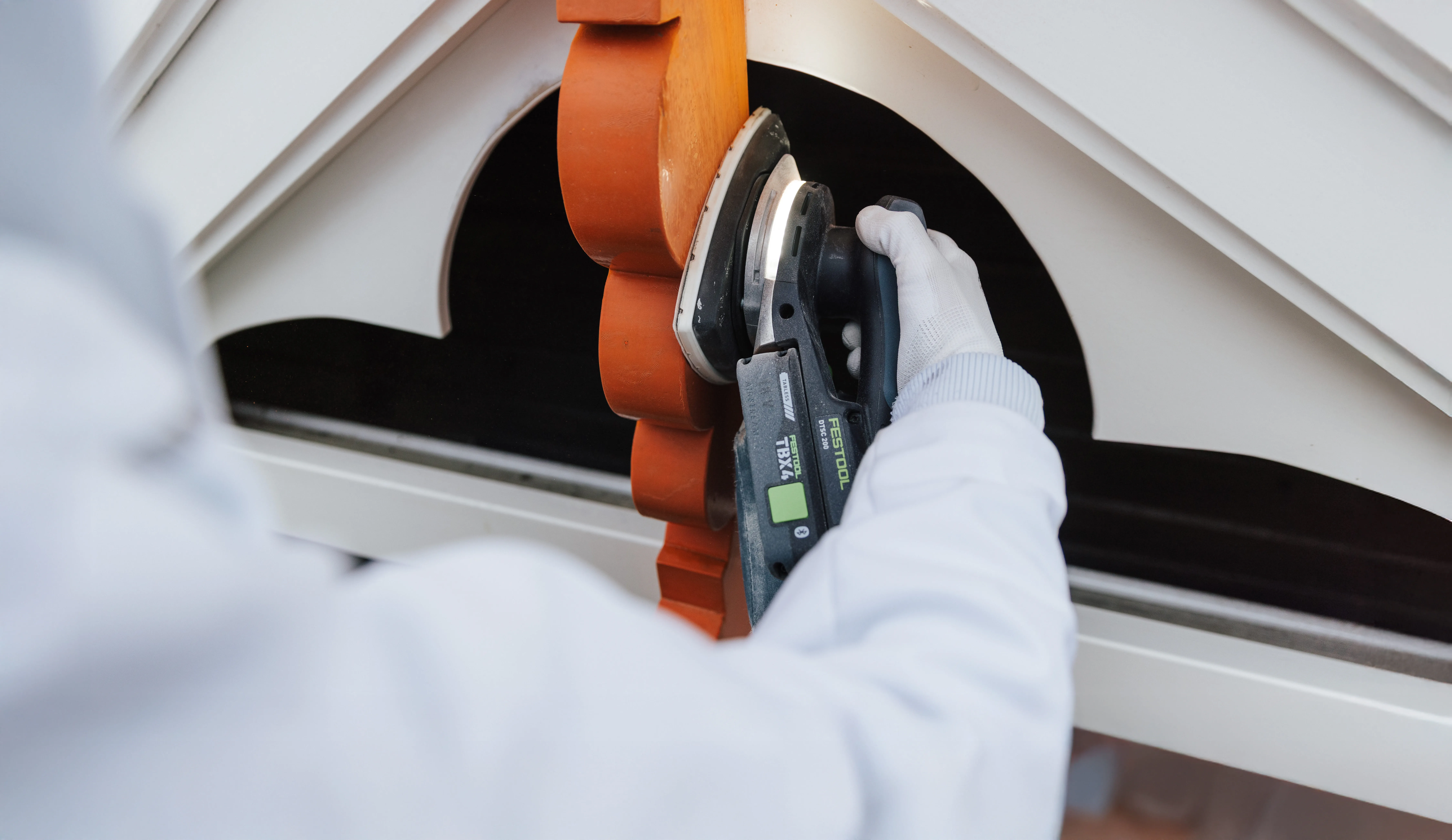 Pendant que Luke ponce, il s'occupe de la peinture, Kevin examine l'état des planches de bois. sur les pignons. En tant que parqueteur de formation et Il a l'œil pour repérer ce qui doit être remplacé. ce qui peut rester et ce qui doit être remplacé. Avec l'Outil oscillant VECTURO, il coupe les parties abîmées. soigneusement les parties pourries. Nouveau planches de bois sont découpées avec précision avec la KAPEX et la Ponceuse excentrique hybride. ETSC 2 125, elles reçoivent le ponçage de finition nécessaire.