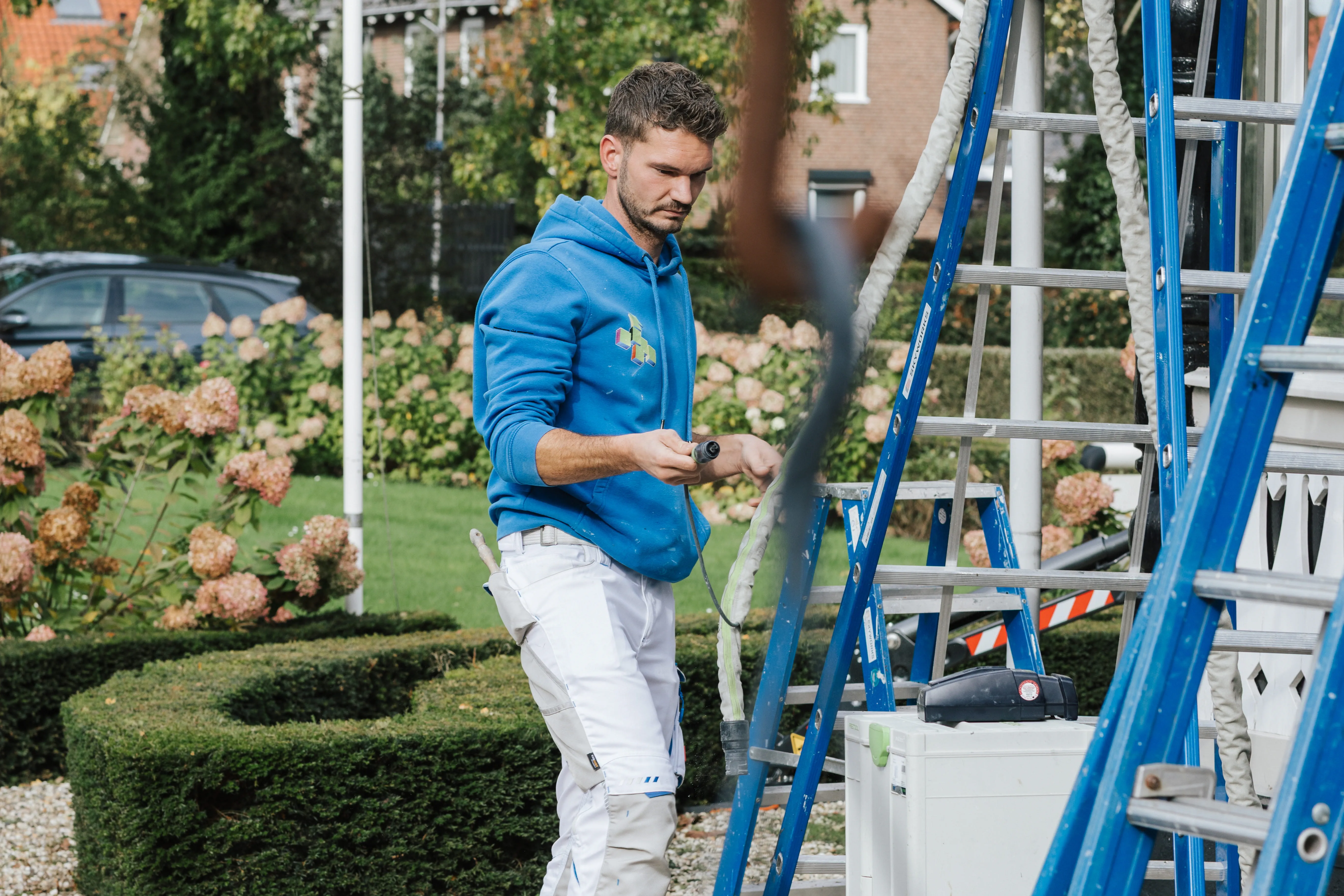 Le jeune peintre attache beaucoup d'importance au fait qu'il travaille même à l'extérieur sur le chevalet avec un système d'aspiration des poussières ou un Sac récupérateur de poussière. Il peut en effet travailler plus proprement et se protéger lui-même. "Beaucoup de mes collègues sous-estiment cela lorsqu'ils travaillent à l'extérieur", s'exclame-t-il du haut de la tour. "Mais ici, en Hollande, vous avez toujours des rafales de vent qui, dans le pire des cas, vous soufflent la poussière au visage lorsque vous poncez".