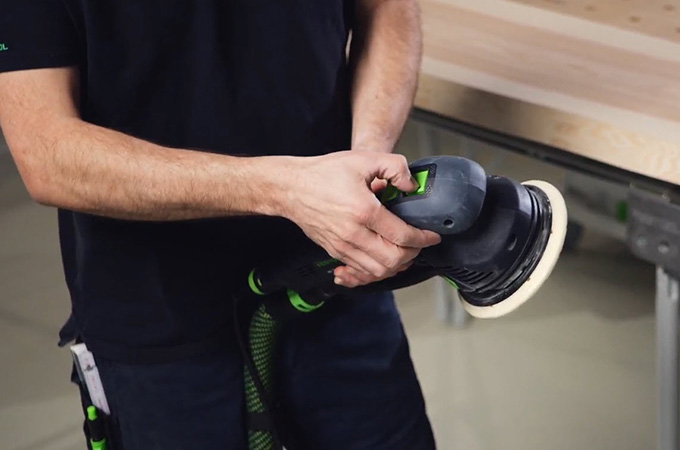 Lors du ponçage de finition, les traces de ponçage qui se sont formées doivent être suffisamment élevées pour qu'elles ne soient plus visibles après le traitement de surface. Pour cela, le grain P120 reste d'abord sur la machine. Le Rotex est ensuite réglé sur le mouvement excentrique (ponçage fin). Ensuite, les traces de ponçage du ponçage grossier sont éliminées. Ici aussi, on travaille en croix.