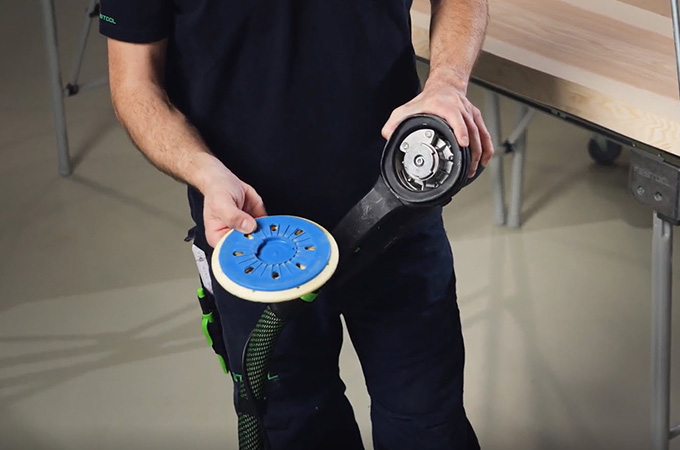 Le plateau peut être changé très rapidement sur le Rotex grâce à l'interface FastFix. Pour cela, il faut d'abord débrancher la prise de courant et mettre le commutateur sur le ponçage grossier. L'arrêt de la broche est alors actionné. Le plateau est ensuite dévissé sans outil dans le sens inverse des aiguilles d'une montre.