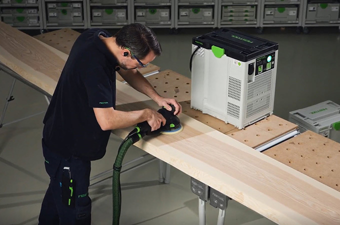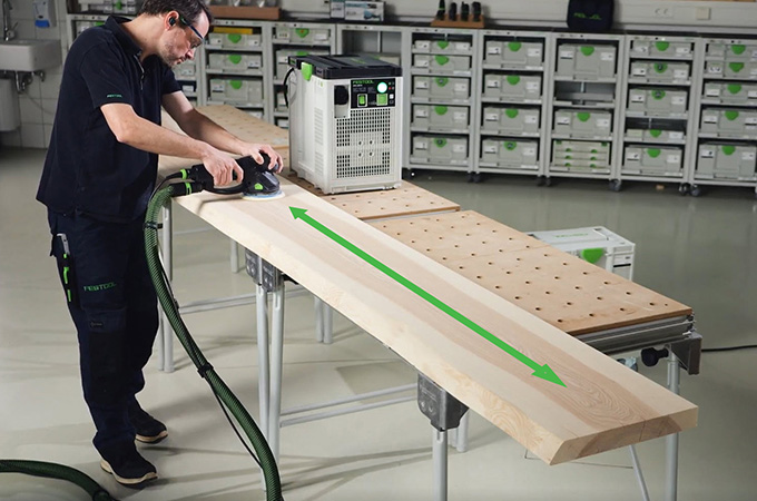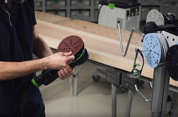 Les surfaces en bois rabotées ont ce que l'on appelle des coups de couteau ou des coups de rabot en raison des fers de rabot. Ceux-ci doivent être poncés avant le revêtement de surface. Cela permet d'une part d'obtenir une surface lisse et homogène et d'autre part de mieux faire pénétrer le revêtement de surface dans le bois. Si vous ne disposez pas d'une grande ponceuse stationnaire, vous pouvez effectuer cette opération avec des ponceuses manuelles. La ROTEX est ici parfaitement adaptée, car elle combine le ponçage grossier et le ponçage excentrique en une seule machine. Comme ce travail s'effectue principalement en atelier, il est préférable de bien aménager son poste de travail. C'est pourquoi nous souhaitons aborder brièvement ici les accessoires de notre système.