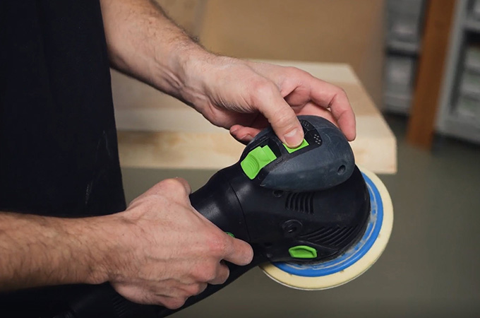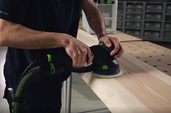 Avec un grain de 80, nous éliminons tous les coups de rabot visibles. La machine est toujours guidée en ponçage croisé jusqu'à ce qu'il n'y ait plus de coups de lame visibles. Pour le ponçage grossier, la machine est toujours guidée à deux mains.