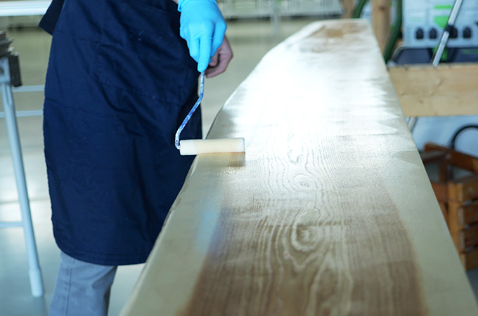 Ces étapes de ponçage s'effectuent également par ponçage croisé. Lors du dernier passage, la ponceuse est toujours guidée dans le sens de la longueur des fibres. Ainsi, les éventuelles traces de ponçage ne sont pas visibles après le traitement de surface.