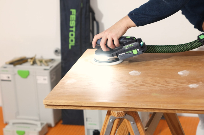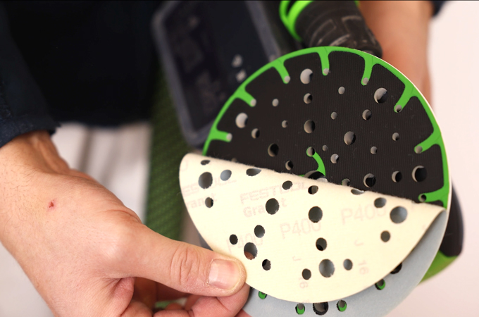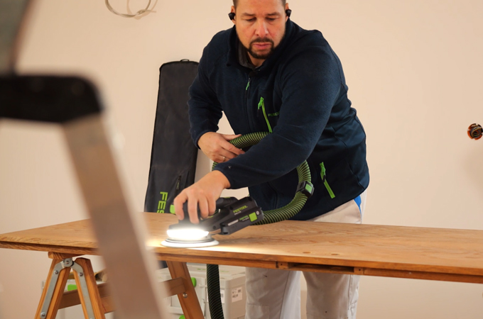 Nous allons maintenant poncer la porte. Pour ce faire, nous utilisons une Ponceuse excentrique - idéalement la ETSC 2 150 - afin d'obtenir un aspect de surface uniforme et de haute qualité. Comme ponçage, nous recommandons le papier abrasif universel Granat de grain P180. Il permet de poncer uniformément les deux côtés du panneau de porte. Grâce à la lumière intégrée, il est possible de détecter directement les irrégularités ou les dommages dans la surface de la porte et, si nécessaire, de les marquer avec une porte-mine.