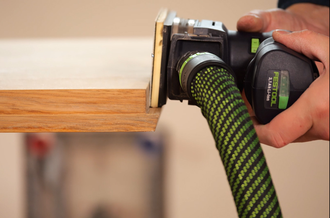 Pour poncer les feuillures du panneau de porte, il est recommandé d'utiliser une ponceuse orbitale. Vous pouvez par exemple utiliser une RTSC 400, également avec un grain de P180. Grâce à sa forme adaptée, les feuillures peuvent ainsi être mieux poncées. Les endroits difficiles d'accès sont finis avec un Abrasif pour ponçage manuel. Après le ponçage, la porte doit être dépoussiérée. Pour ce faire, il convient d'utiliser un aspirateur adapté avec un pinceau brosse.