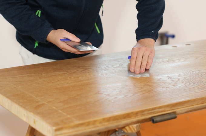 En ponçant la porte avec l'ETSC 2 et sa lumière intégrée, on remarque déjà les imperfections et les rayures. La petite lampe de travail KALC permet de contrôler à nouveau la surface avec précision et de marquer les zones endommagées avec un crayon. Les dommages sont ensuite réparés à l'aide d'une spatule japonaise et d'une résine synthétique ou d'un enduit fin afin d'obtenir une surface aussi lisse que possible. Astuce : lors de l'application, veillez à bien racler le mastic pour obtenir un résultat uniforme.