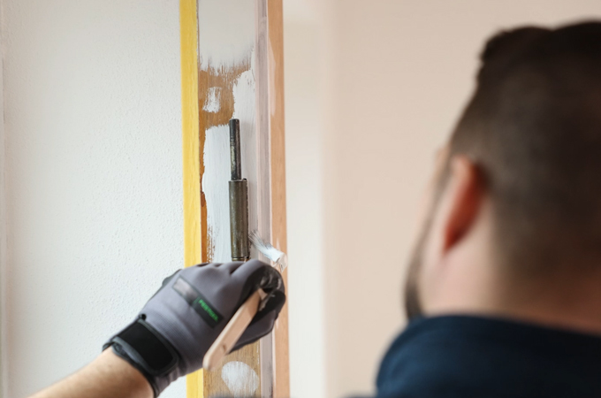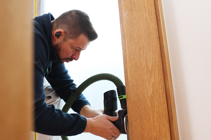 Pendant que le mastic sèche sur le panneau de porte, le cadre de porte est également préparé. La procédure est en grande partie la même que pour le panneau de porte. Pour le cadre, il est recommandé d'utiliser une ponceuse orbitale comme la RTSC 400, car il comporte de nombreuses arêtes et feuillures. Ici aussi, nous utilisons l'Abrasif Granat de grain P180. Les finesses et les détails peuvent ensuite être finis avec l'Abrasif pour ponçage manuel Granat. La poussière restante est aspirée à l'aide du Pinceau brosse et du CTMC Midi. Les zones endommagées doivent également être réparées à cette occasion avec du mastic et de la pâte japonaise.