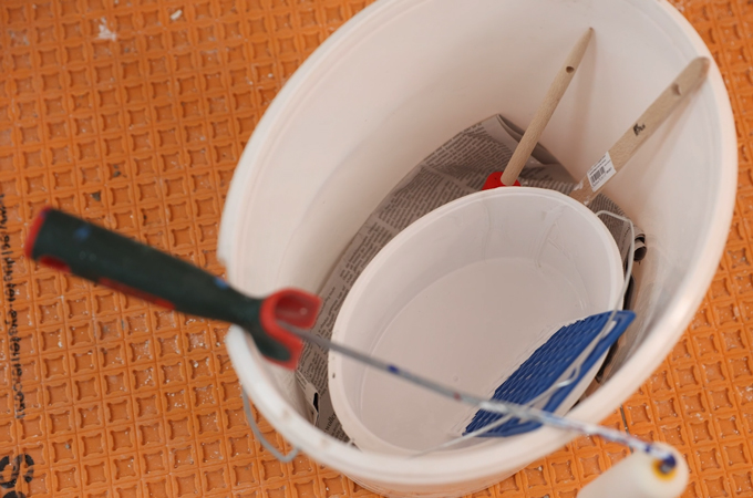 Avant de peindre, les surfaces sont à nouveau nettoyées avec un chiffon anti-poussière. Les endroits difficiles d'accès sont recouverts d'un ruban doré pour protéger le mur par exemple. Les outils de peinture et la sous-couche à utiliser sont préparés. et peuvent être placés sur le CTMC Midi à une hauteur de travail confortable. pour les protéger, nous vous recommandons de recouvrir l'aspirateur d'un journal et de ranger les outils et la peinture dans un seau, vous éviterez ainsi de les salir inutilement.