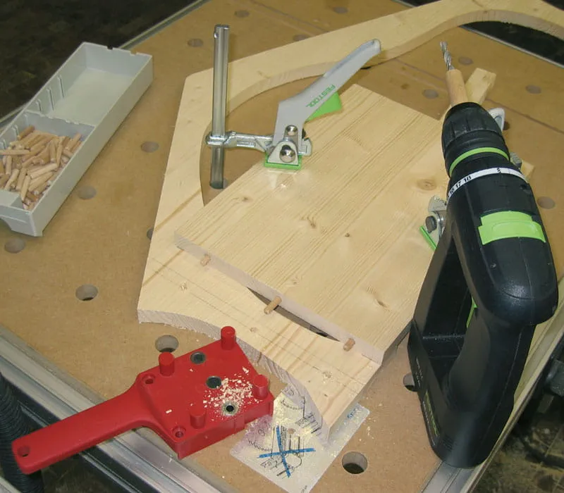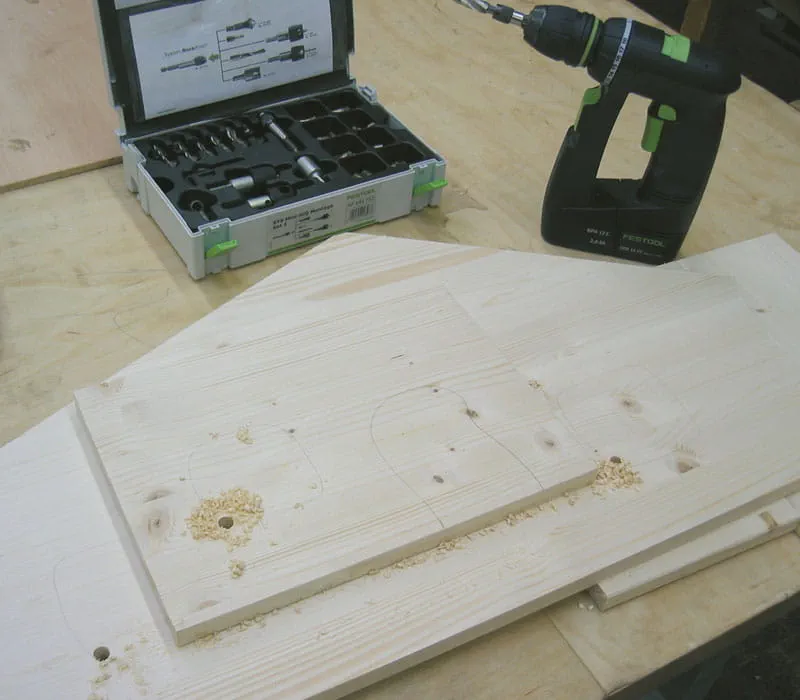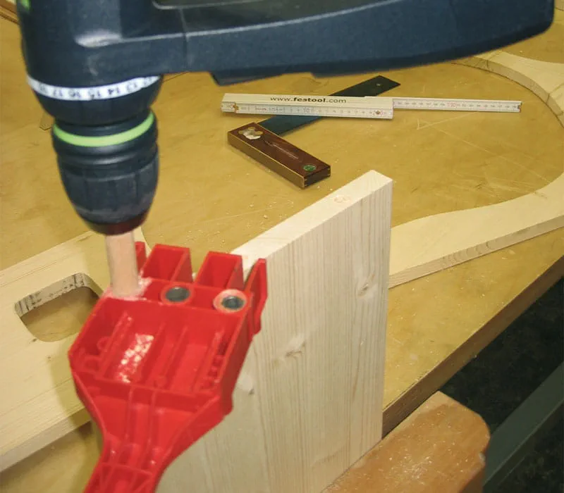 Percer les trous des chevilles (ø 6 mm) dans le bord transversal des parois latérales à l'aide d'un gabarit pour chevilles.