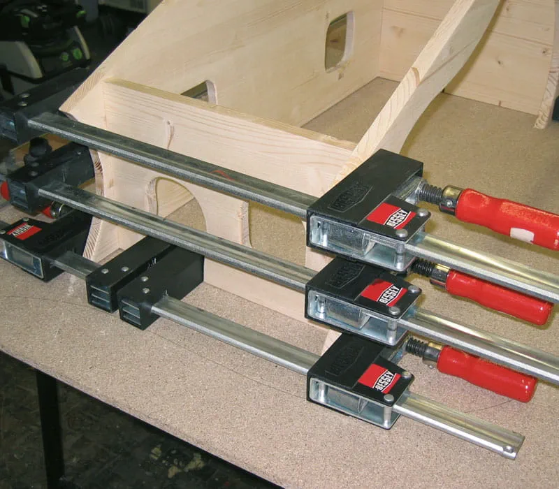 Serrer l'ensemble avec des serre-joints et des cales de protection ou des serre-joints spéciaux (par ex. pour l'assemblage de caissons de meubles). Installer deux serre-joints dans la porte (voir figure).