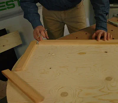 Serrez ensemble les deux pignons et poncez l'arc du haut avec du papier abrasif à gros grain. Si vous possédez une défonceuse équipée d'une bague de copiage, vous pouvez aussi fraiser les arrondis des parois du pignon. Tracez des repères aux emplacements de la sous-structure (photos 10, 11) sur les côtés du pignon.