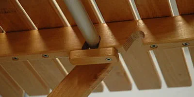 Les évidements d'emboîtement pour le réglage en hauteur doivent être réalisés sur les baguettes transversales (photo 2) avec une scie à main ou une scie sauteuse. Arrondissez maintenant toutes les baguettes du plateau (photo 1). Sur un support de travail rectangulaire, posez ensuite les baguettes sur le dos et serrez-les les unes contre les autres. Posez ensuite une baguette transversale (photo 2) en alignant l'une de ses extrémités sur le bord. À l'aide d'un mètre pliant, mesurez